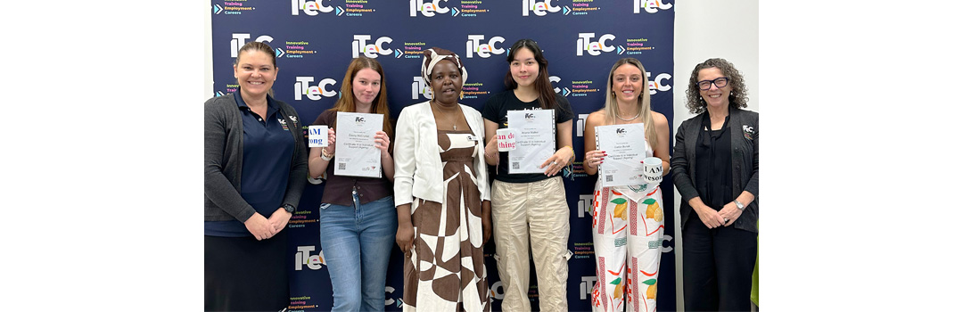 Photo L-R: Rebeccas Radic (ITeC RTO Manager), Ebony McCrystal, Trymore Kuveya (ITeC Trainer), Ariana Walker, Caitlin Bursill and Tania Tsiamis (ITeC General Manager)